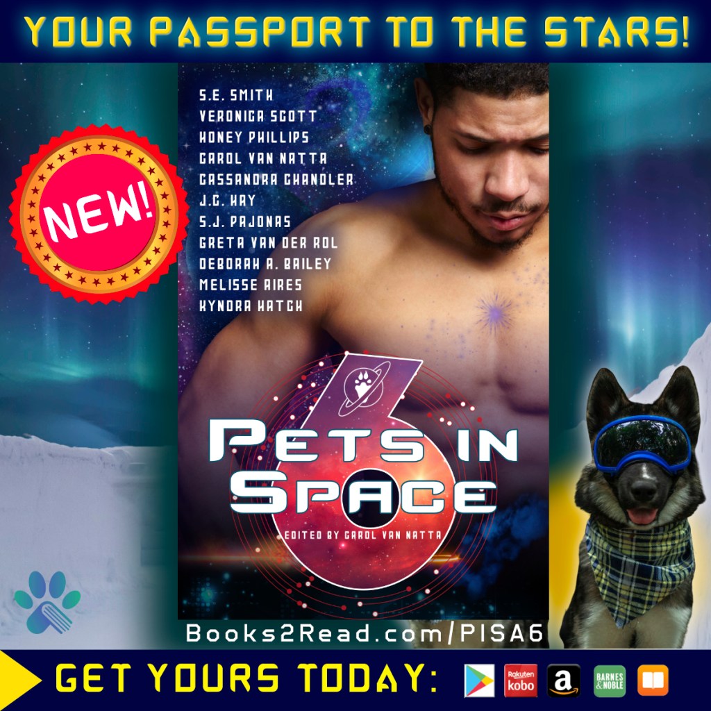 Pets in Space 6 is edited by Carol Van Natta. Contributing authors: S.E. Smith (NY Times and USA TODAY bestselling author), Veronica Scott (USA TODAY bestselling author), Honey Phillips, Carol Van Natta (USA TODAY bestselling author), Cassandra Chandler (USA TODAY bestselling author), J.C. Hay (USA TODAY bestselling author), S.J. Pajonas (USA TODAY bestselling author), Greta van der Rol, Deborah A. Bailey, Melisse Aires, and Kyndra Hatch.